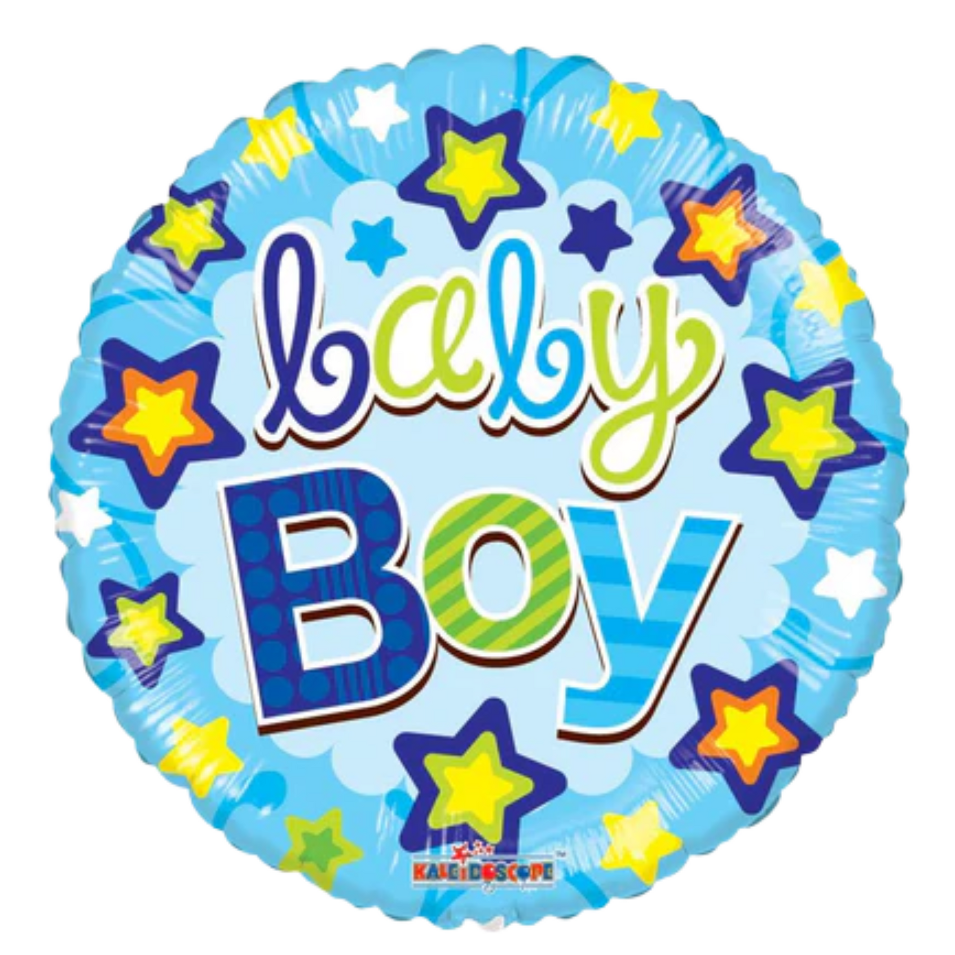 Celebrate the arrival of a baby boy with this cheerful 18-inch round Baby Boy foil balloon. Featuring bold and colorful “Baby Boy” text surrounded by bright stars in blue, yellow, and green tones, this design is perfect for baby showers, welcome home celebrations, or newborn photography setups.