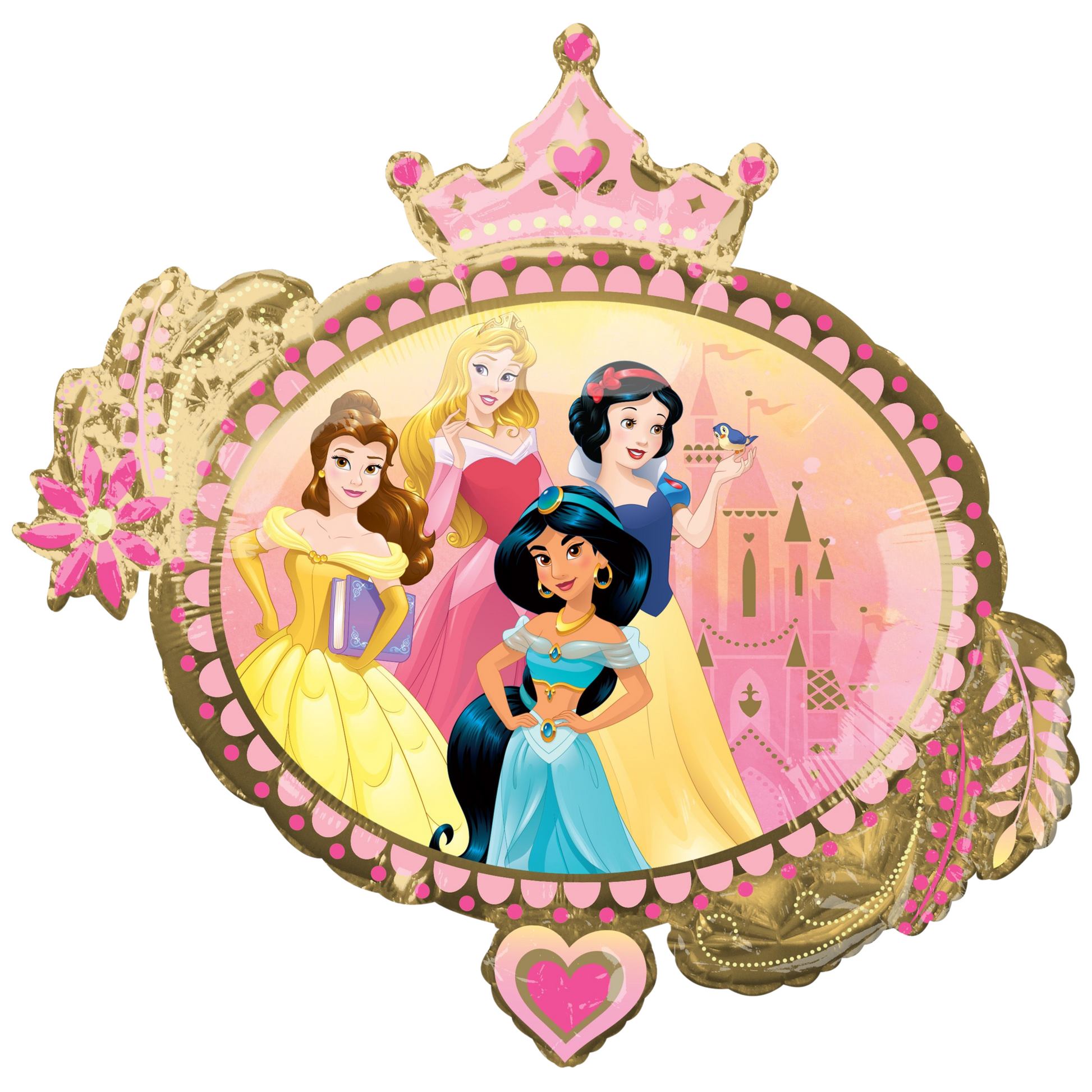 Add a royal touch to your celebration with this 34-inch Disney Princesses crown frame foil balloon. Featuring Belle, Aurora, Snow White, and Jasmine inside an ornate golden frame with pink crown and floral details, this stunning balloon is perfect for princess-themed parties and birthdays.